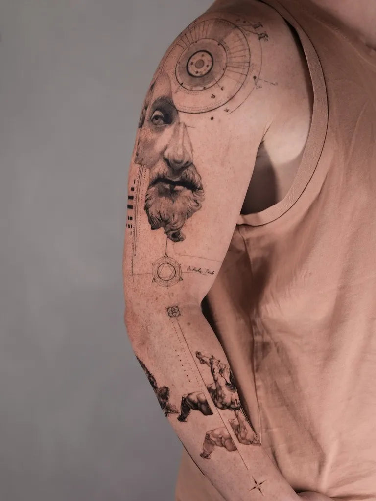 Big Geometric Portrait Compass on Men Arm Tattoo by @zszywka_tattooing