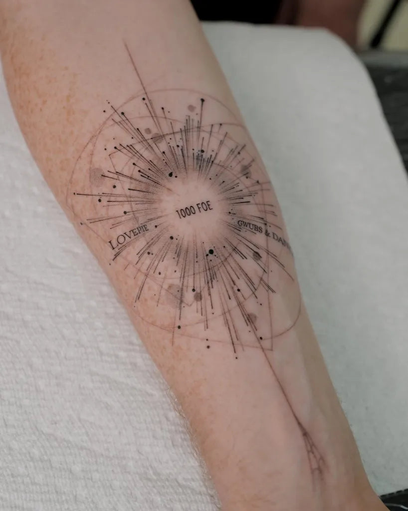 Small Geometric Mandala with Sunburst and Text on Women Arm Tattoo by @jjjaylud