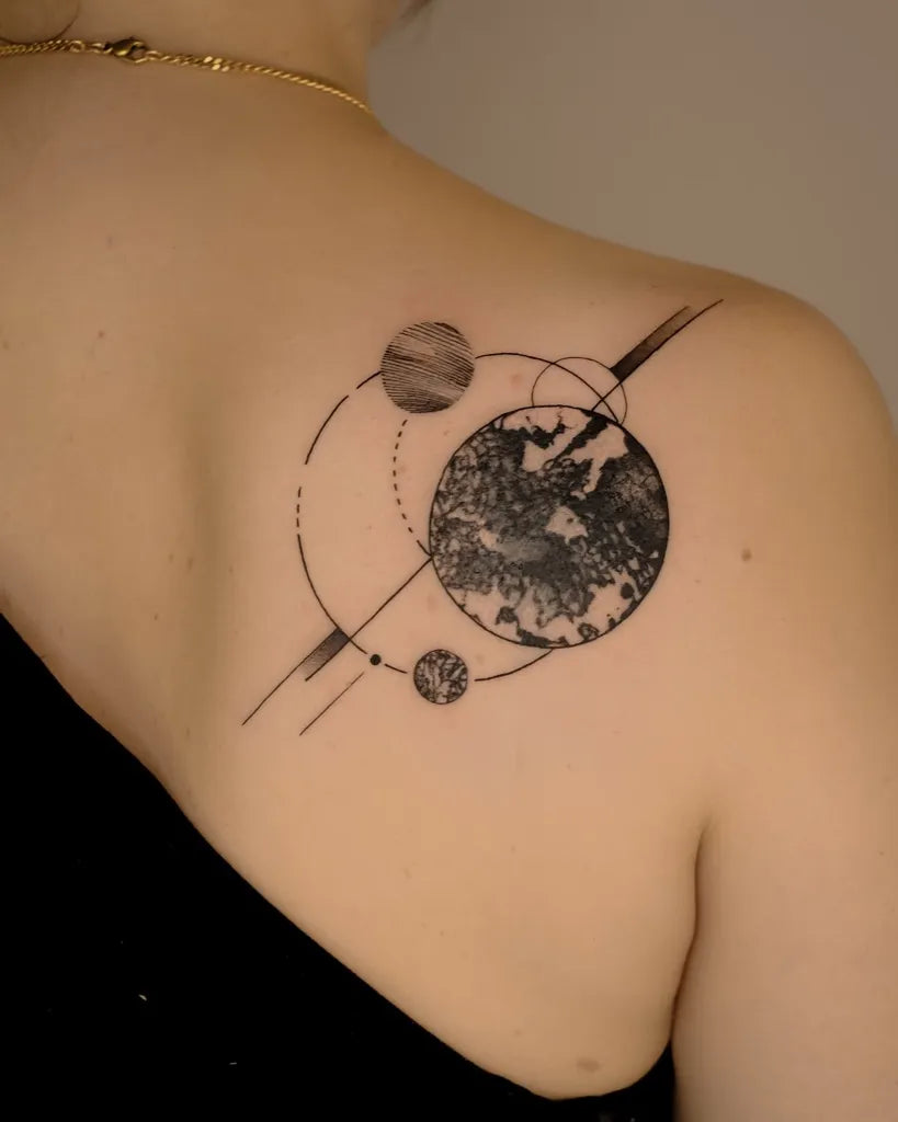 Small Geometric Planets and Orbits on Women Shoulder Tattoo by @mashatattoo