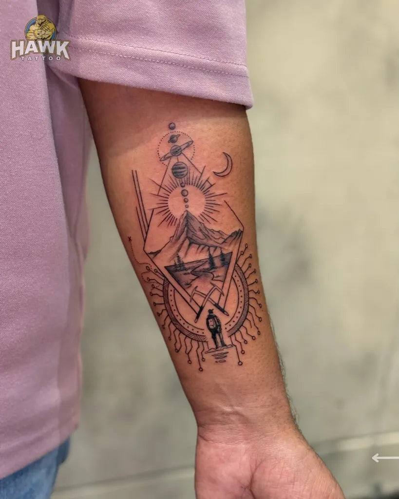Big Geometric Sun Moon Mountain on Men Arm Tattoo by @hawktattooofficial