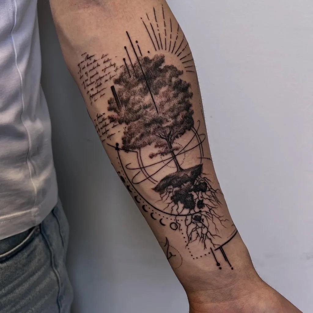 Big Geometric Tree with Roots and Script on Men Arm Tattoo by @artcraft_tattoo