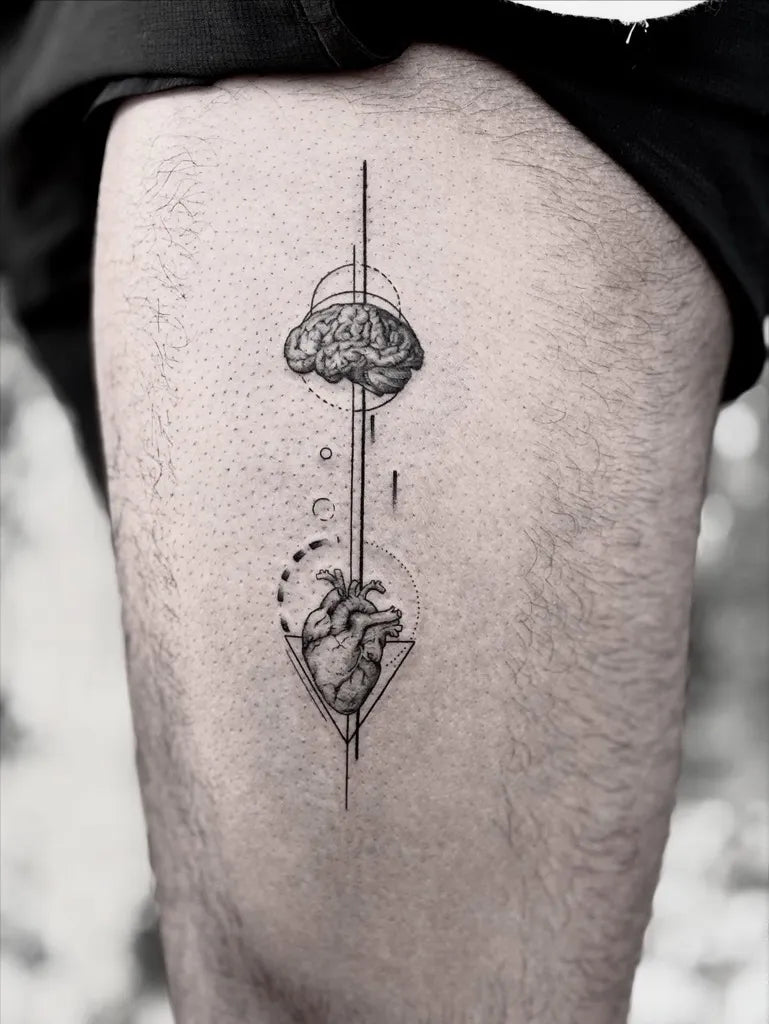 Small Geometric Brain Heart Geometric Lines on Men Thigh Tattoo by @alexshimray