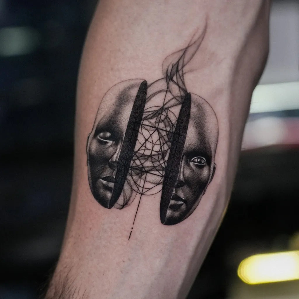 Small Geometric Split Faces with Smoke on Men Arm Tattoo by @aj_tats
