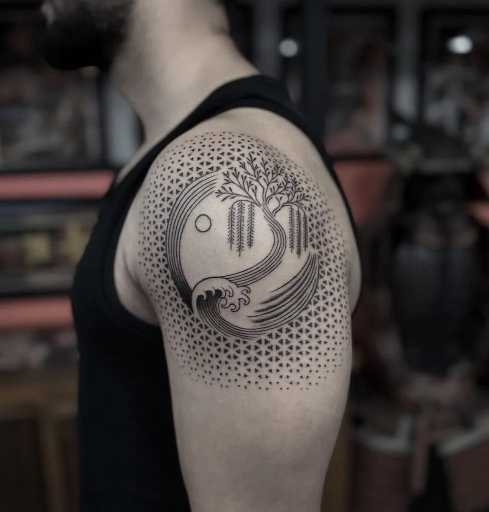 Small Geometric Yin Yang Tree Waves on Men Shoulder Tattoo by @juzzytattoo