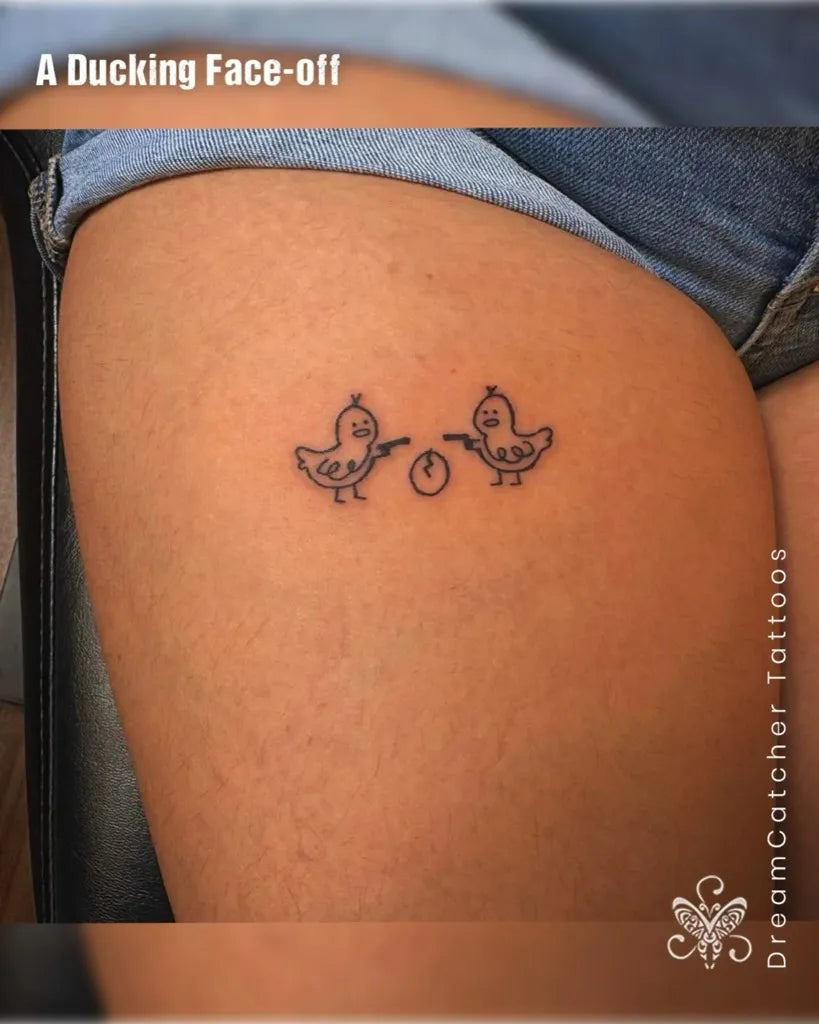 Small Linework Dueling Ducks on Thigh on Women Thigh Tattoo by @dreamcatcher_tattoos