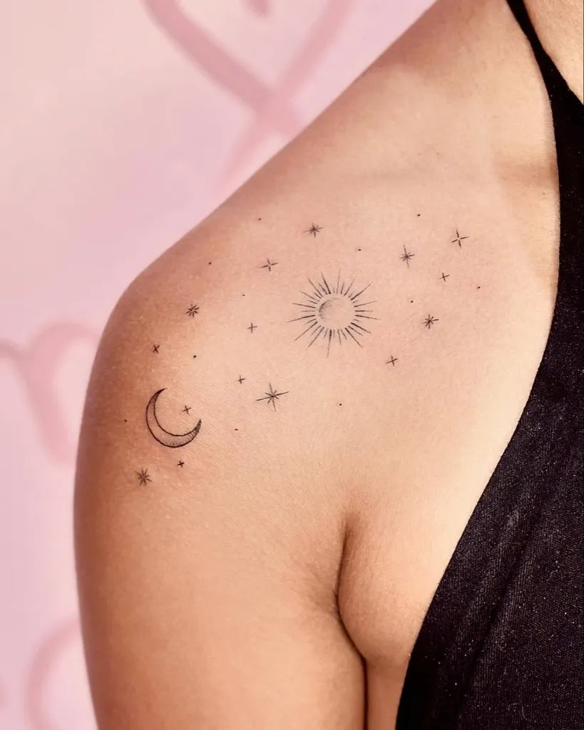 Small Minimalist Sun Moon Stars on Women Shoulder Tattoo by @lauralaporaestattoo