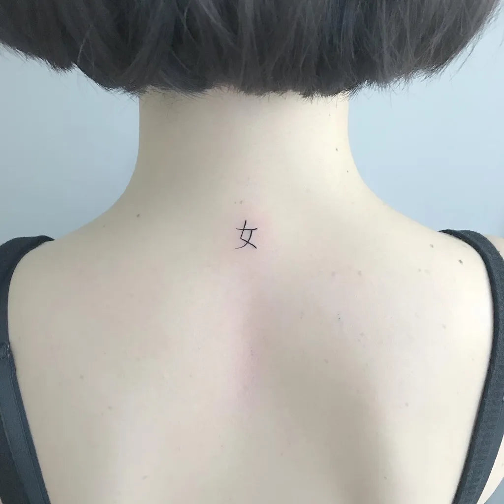 Tiny Minimalist Kanji Character on Women Neck Tattoo by @beylikduzudovmeci