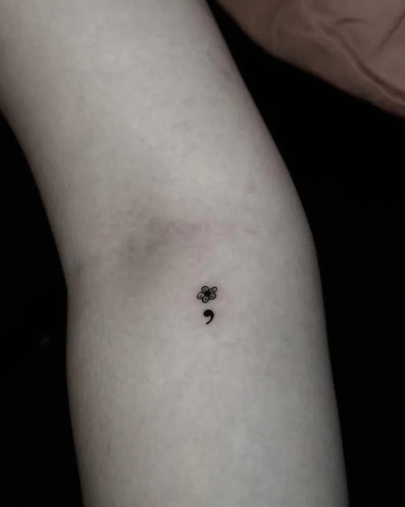 Tiny Minimalist Semicolon on Women Elbow Tattoo by @scrttattooshop