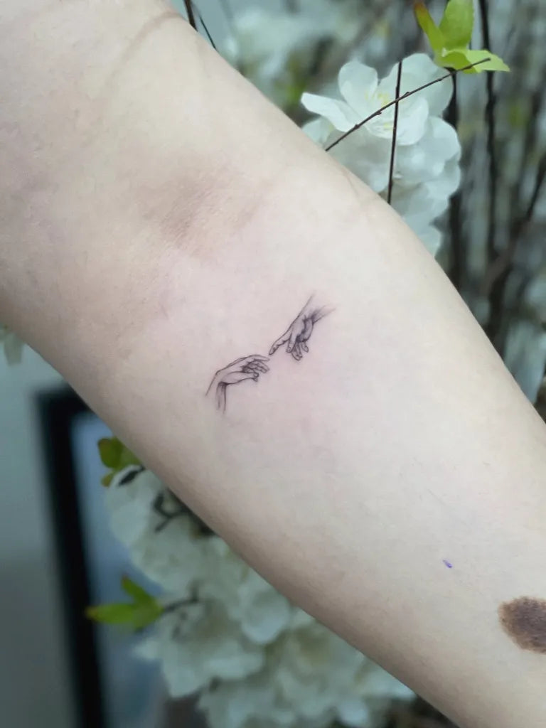 Tiny Minimalist Two Reaching Hands on Women Forearm Tattoo by @memo.tattooartist