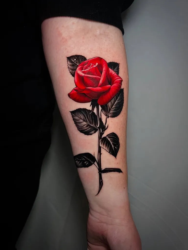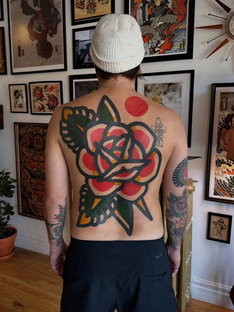 • Traditional rose tattoo: Bold lines and saturated color for clarity, longevity, and vintage appeal.