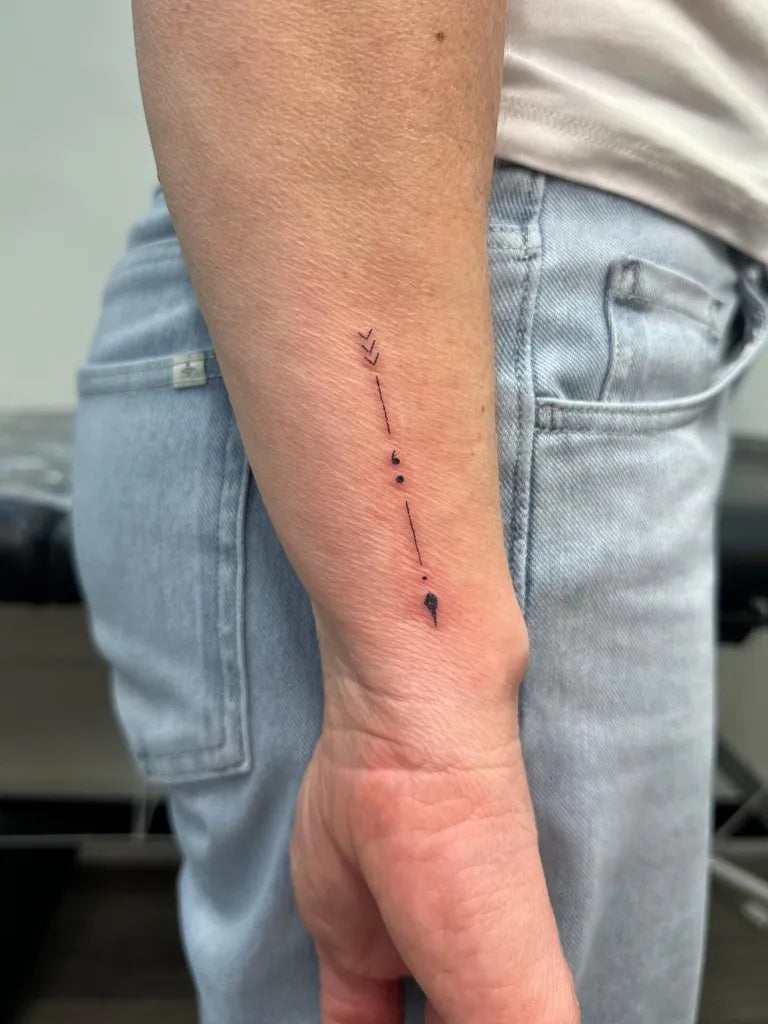 Small Minimalist Arrow Semicolon on Women Forearm Tattoo by @inked_by_steph