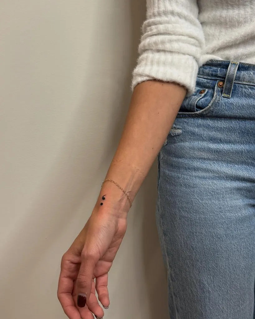 Tiny Minimalist Semicolon on Women Wrist Tattoo by @melaniejill.tattoo