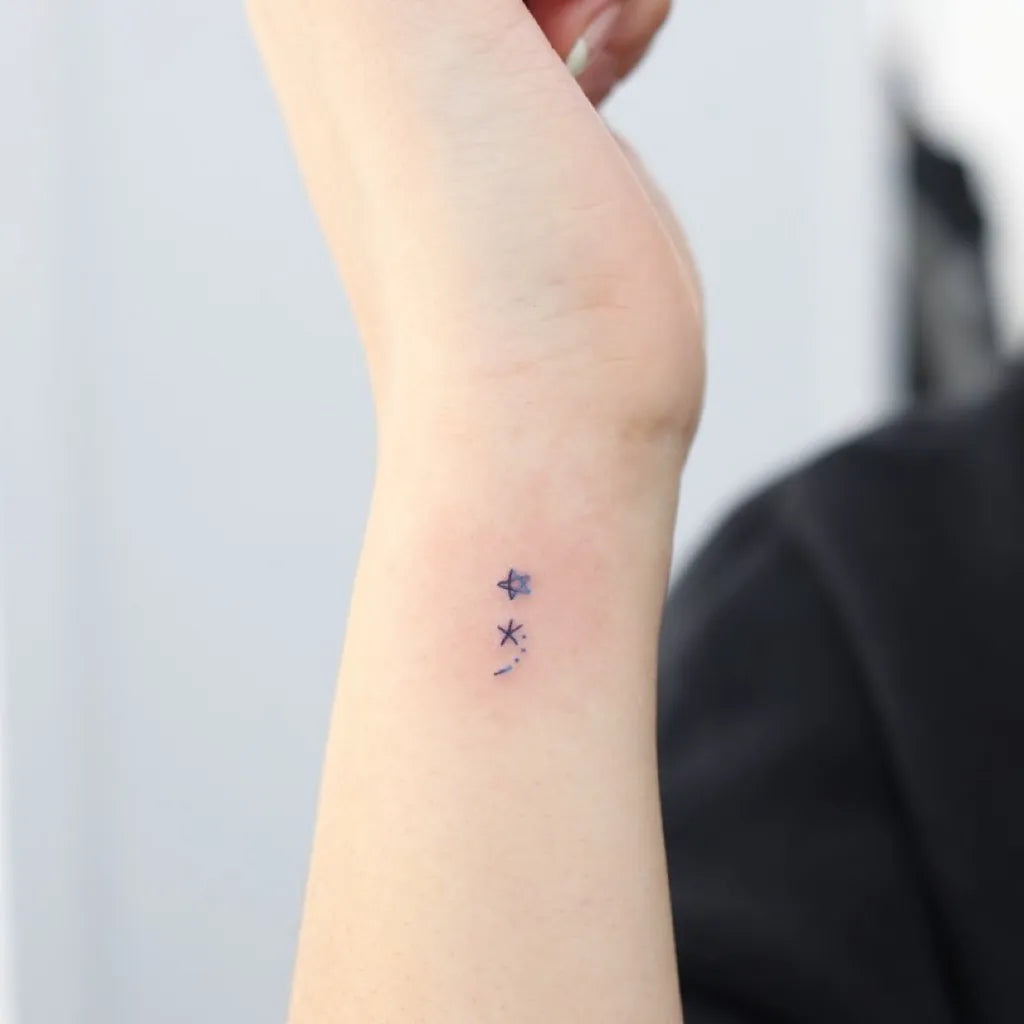 Tiny Minimalist Semicolon and Stars on Women Wrist Tattoo by @wittybutton_tattoo